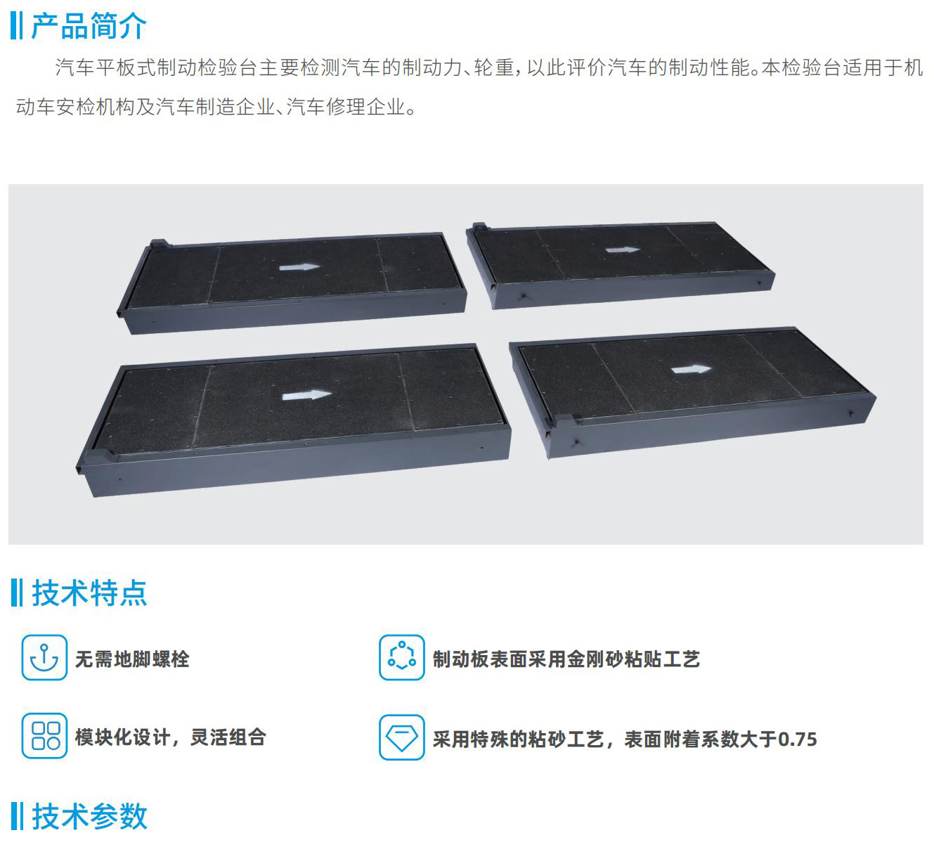 汽車平板式制動檢驗臺主要檢測汽車的制動力、輪重,以此評價汽車的制動性能。本檢驗臺適用于機動車安檢機構及汽車制造企業、汽車修理企業。